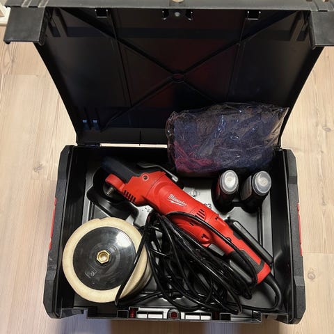 ETC Tools poleringsmaskin med tilbehør i koffert. Elektrisk poleringsmaskin med poleringspute og ekstra tilbehør som vist på bildene. Leveres med bruksanvisning og oppbevaringskoffert. Egnet for polering av ulike overflater der det er behov for maskinell polering. Slik som bil, båt og Nc
