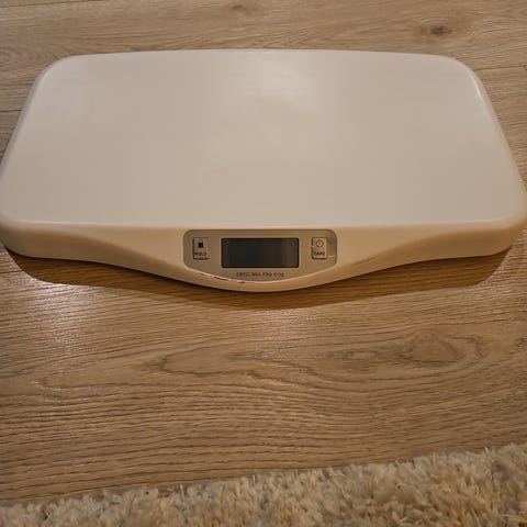 Elektronisk babyvekt digital i hvit plast. Vekten har buet liggeflate tilpasset spedbarn og små barn. Digitalt display med tydelige tall og knapper for av/på og valg av enhet. Drives av CR2032 litiumbatteri (knappcelle). Egnet til å følge med på vektutvikling hos baby hjemme. Under har vekten sklisikre føtter for stabil plassering på gulv eller bord. Så vidt brukt til et barn. Fungerer som den skal. kom gjerne med bud!