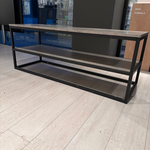 Todelt hylle i moderne, åpen ramme-konstruksjon. Hyllen har metallramme og hyller i lyst tre. Nederste del har tre uttrekkbare skuffer i samme lyse treverk.