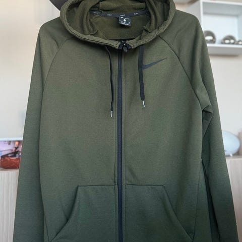 Nike hettegenser for dame i størrelse S. Genseren er grå og laget i bomull. Den har hette med snøring, ribbekanter nederst og på ermene, samt kengurulomme foran. Lite Nike-logo på brystet. Passer til hverdagsbruk og fritidsaktiviteter.