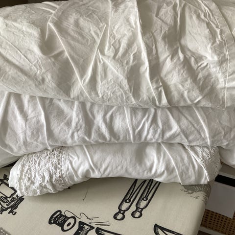 Hvit kappelaken, sengekappe, sengeteppe i str 200 × 90. Flat oppå og 'volanger'/kappe ned over sengen.