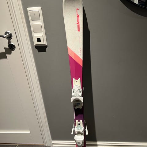 Elan alpinski til junior med binding, lengde 140 cm. Kun brukt en håndfull ganger. Fremstår som nye. Ingen slitasje. Farge turkis med magenta skrift.