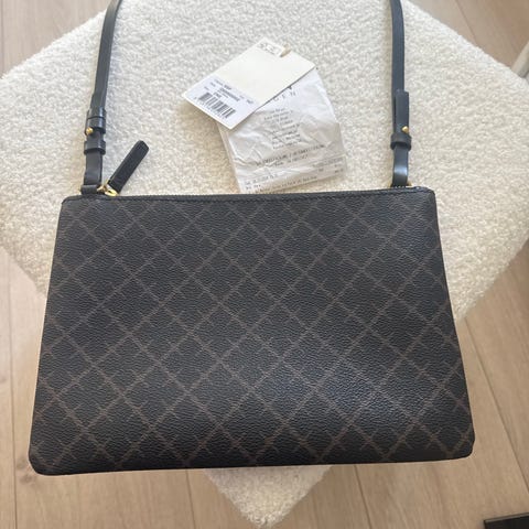 Vesken har justerbar rem og lukkes med dekorativ knapp.