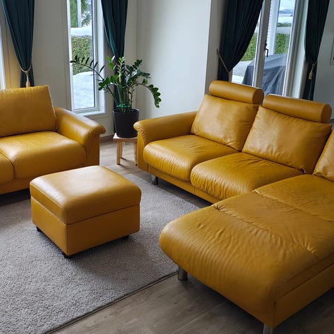Stolene ser veldig hele og fine ut, helt nydelig å sitte i, men sofaen ser dessverre lit stygg ut på sitteputen pga. hund som blånekter å ligge i hundesengen når vi ikke er hjemme 🙈
