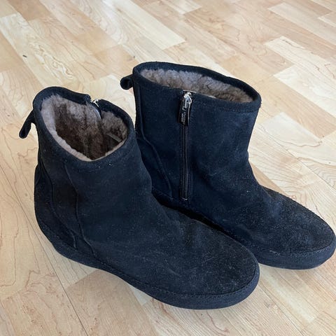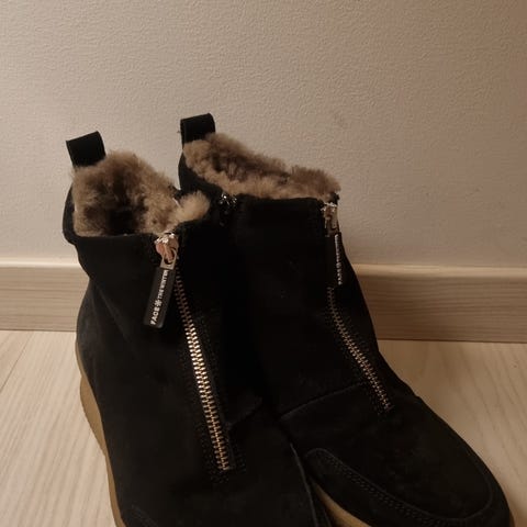 & Other Stories vinterstøvler i størrelse 41. Støvlene er laget i semsket materiale i mørk blå farge med glidelås foran. De har lys, grovmønstret yttersåle i gummi og mykt, pelsfôret innside for ekstra varme. Modellen er ankelhøy og egner seg til bruk i kaldere værforhold.