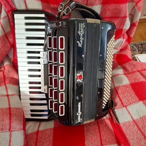 Testet av profesjonell musikker og fungerer som det skal. God klang, tett belg og alle registre fungerer. Klassisk rød perlemor-finish.