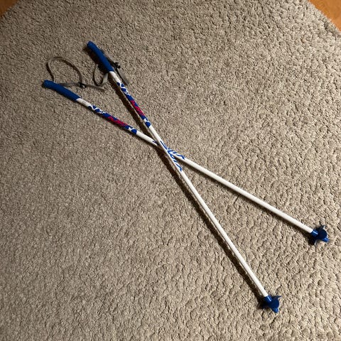 Rosa Swix ski-staver i lengde 85 cm.. Stavene har hvite håndtak med håndreimer og runde trinser nederst.
