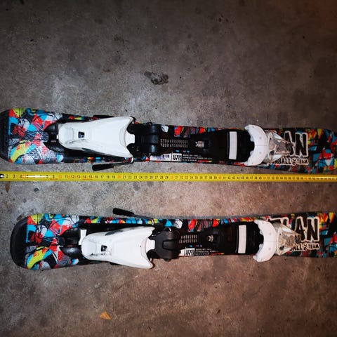 Twintip alpinski med lengde 128 cm. Trenger sikkert litt service såle/stålkanter.