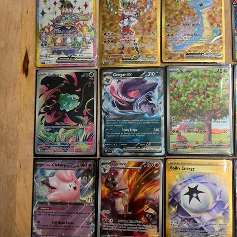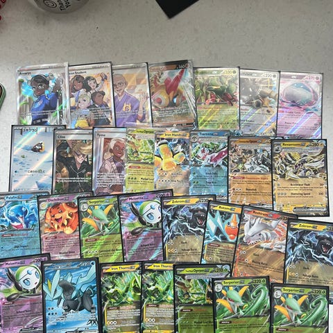 Pokémon samlekort lot med ulike EX-, GX- og V-kort. Kortene er holografiske/foil og oppbevares i plastlommer i en samleperm. Inneholder flere forskjellige Pokémon-figurer og motiv, hovedsakelig i full art- og spesialutgaver. Egner seg for samling, bytting eller som tillegg til eksisterende Pokémon-kortsamling. Har flere.
