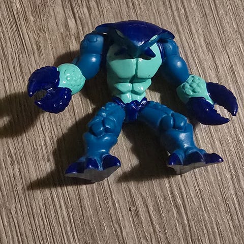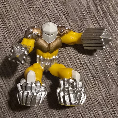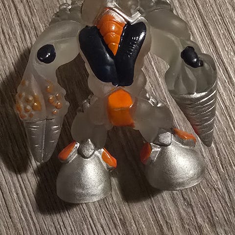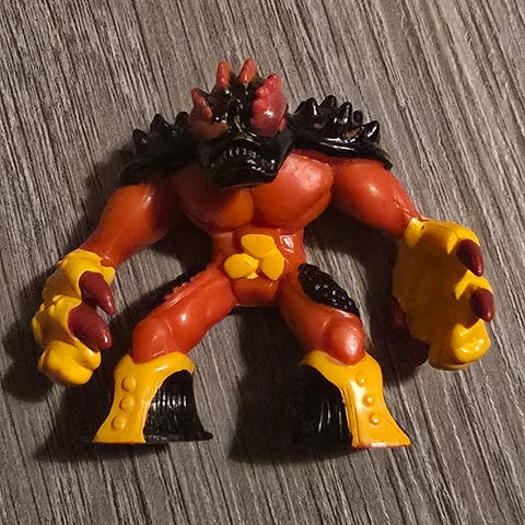 Figur leke i plast med røde ben, grå overkropp og armer, samt gule pigger. Figuren har store hansker med klo-lignende hender og støvler. Egnet som liten lekefigur til barn eller som samlefigur. Størrelse er ikke oppgitt, men figuren er liten og håndholdt.Dette er en actionfigur av karakteren The Screaming Guardian fra leketøysserien Gormiti.