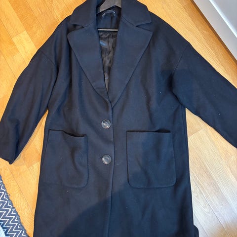 Cubus vinterjakke er svart og laget i 52% ull og 48% polyester . Den har krage og belte i livet.