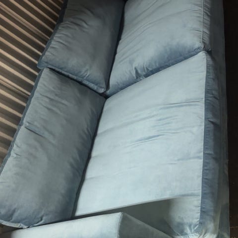 Fløyelssofa, stor 2seter mørkeblå farge. Kvalitetssofa. Sittehøyde43, rygghøyde 65, sittedybde 54. God å sitte i,løse ryggputer med avtagbart trekk. 2 pynteputer følger med