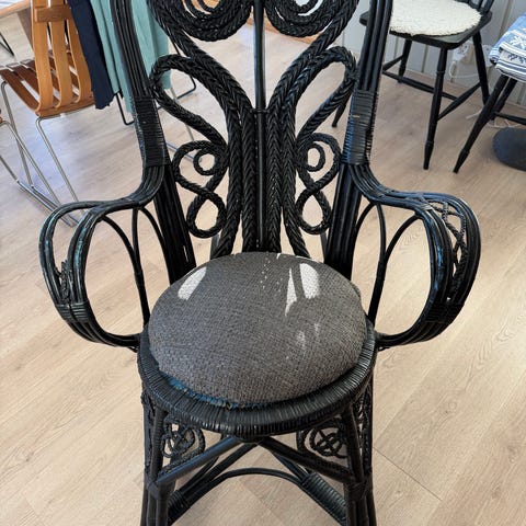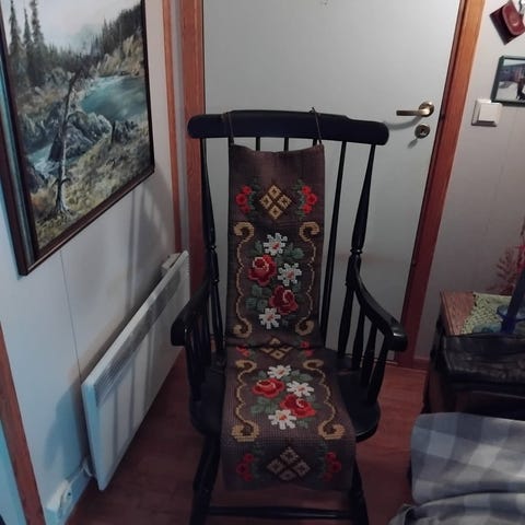 Gyngestol i tre med høy rygg og armlener. Stolen har buet sete og tradisjonelle dreide detaljer på bein og armlener. Overflaten er sortmalt med synlig slitasje i maling og treverk etter tidens tann. Ene gjengemeien er avbrukket, men har ingen betydning for funksjon. Jeg har brukt den mange ganger til å dysse barn og barnebarn i søvn med gode resultater! Men nå er har jeg ikke plass til den lenger. Selger den m vondt i hjertet!