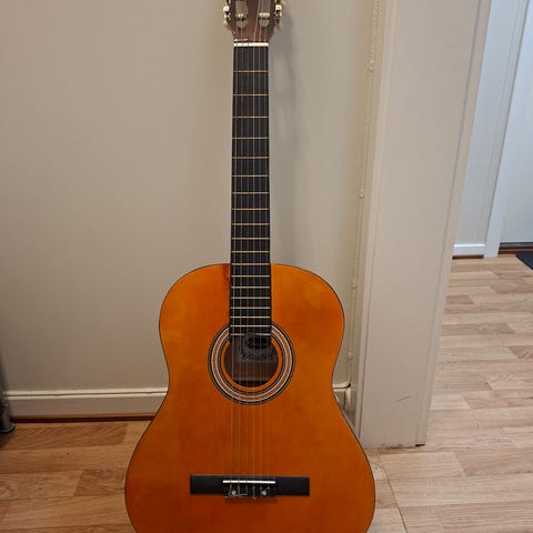 Akustisk gitar i naturfarget utførelse. Gitaren har klassisk kroppsform med lys topp og mørkere sider og bunn. Den har gripebrett med båndmarkeringer og standard stemmeskruer. På bildene følger det også med plekter, klips-stemmer fra Gear4music og ekstra nylonstrenger fra Gear4music og D’Addario Pro-Arte, som kan brukes som reservedeler eller ved strengebytte. Dette er en akustisk gitar egnet til generell spilling og øving.