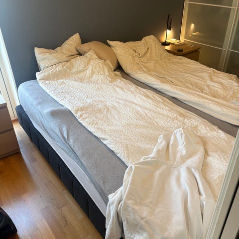 Dobbelseng 160cm med svane madrasser og IKEA overmadrass. Senga er blitt brukt i en periode for mange år si, etter det har den blitt brukt som gjesteseng. En noen bruksmerker på både seng, madrass og overmadrass.