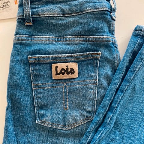 Lois damejeans i blå denim. Innerbenlengde; 68 cm. Bootcut. Buksen er i størrelse S med livvidde W26 og lengde L32. Materiale i bomull. Klassisk femlommersmodell med glidelåsgylf og knapp, samt påsydde baklommer med Lois-logo. Fargen er en lys blå vask (sky bleach) som gir et brukt preg. Hentes i Bergen sentrum/sender ikke