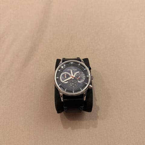 Police klokke med Sort skinnreim. Er noen år gammel, men ikke mye brukt.