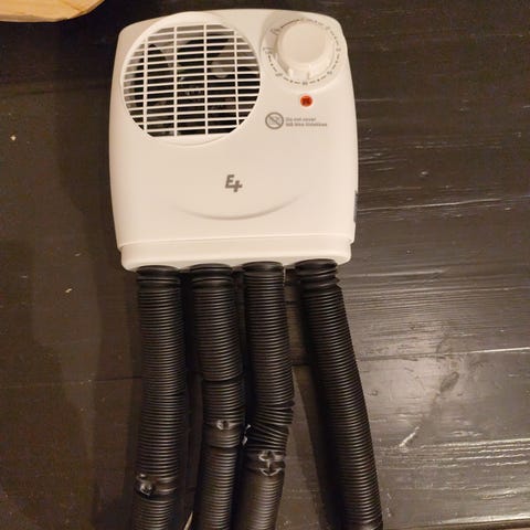 Adax skotørker i hvit plast. Enheten har fire fleksible slanger for tørking av sko eller støvler. På fronten finnes av/på-bryter og dreiehjul for tidsinnstilling. Skotørkeren er beregnet for veggmontering, med festeanordninger på baksiden og tilkobling via strømledning. Egnet til innendørs bruk for tørking av fottøy i gang, bod eller vaskerom.