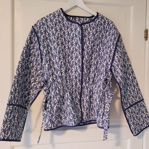 Bik Bok jakke i størrelse XS for dame. Jakken er laget i bomull og har et blått mønster med kontrastkanter. Modellen har rund hals, lange ermer og knytebånd nederst. Passer som lett ytterjakke eller som et ekstra lag over topp eller kjole.