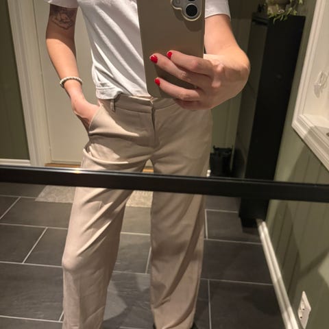 By Malene Birger bukse for dame i størrelse M. Buksen er beige. Modellen har vide ben og hel lengde, med søm langs midten av benet foran som gir et rent uttrykk. Stoffet har en myk og lett struktur.