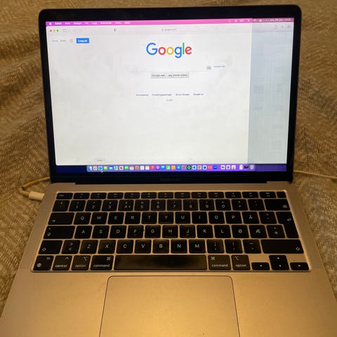 Macbook Air 2020 M1, fungerer bra, men har en mangel en må være obs på: En mindre del av skjermen (som vist på bilde i høyre side) er svart. Ved oppstart blir det meste av skjermen svart 10-20 sekunder inntil bilde kommer på, enkelte ganger lenger. Antagelig er det et løst ribbon kabel i maskinen, så langt kan den brukes. Egner seg kanskje best til noen som liker å bruke ekstern skjerm.