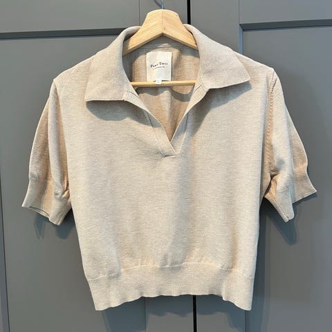 Part Two genser/overdel str M. Genseren er i bomull/viskose og har kort erm, krage og v-utringning. Farge: hvit/svart-stripet.