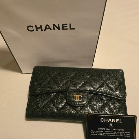 Chanel Dame lommebok laget i lammeskinn Produktet har flere rom for kort og oppbevaring, med en svart ytre farge og rosa innside. Lommeboken er designet for damebruk.