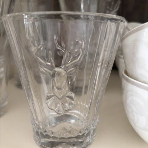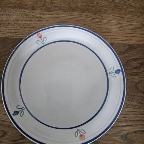 Koppene er det klassiske, landlige motivet med hane og blå dekorrand, perfekt for hytte, lysthus eller et landlig kjøkken.