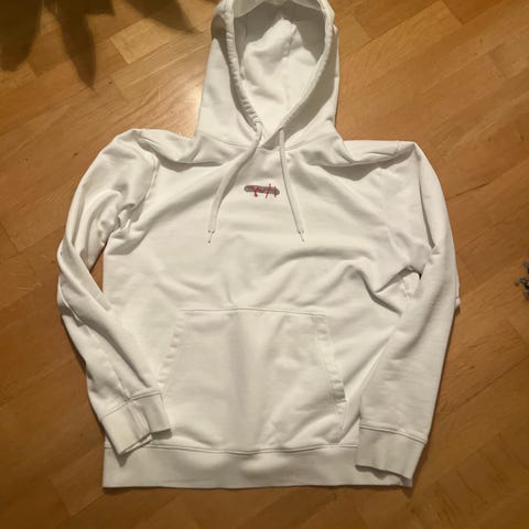 Vi selger en nydelig lys gra Hugo Boss genser. Genseren har hvit innside og er hvit inni hetten. Logo i hvitt. Hette med snøring.