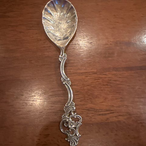 Dekorativ sølvskje med utskårne detaljer i skaftet og mønster i skjehodet. Skeen har et klassisk, ornamentert design som egner seg godt som samleobjekt, serveringsskje eller pynt. Passer til bruk i borddekking eller som del av en samling av eldre bestikk i sølv eller sølvfarge.