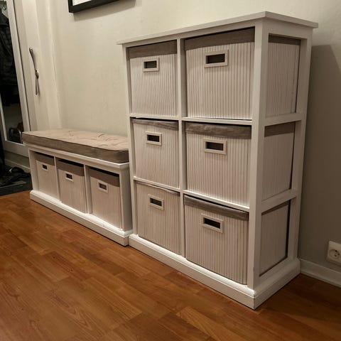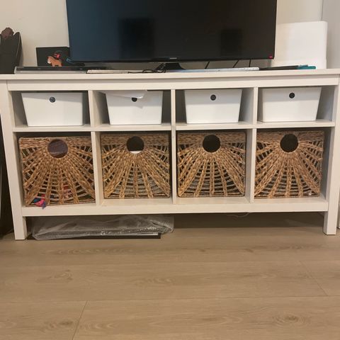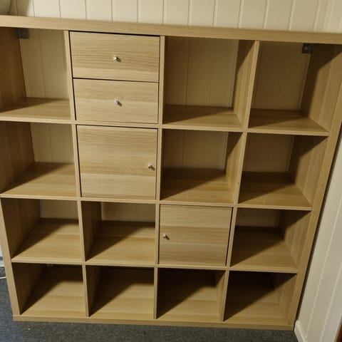 Pent brukt Kallax hylle fra IKEA selges. Har skuffer i to av «rommene» i hyllen.