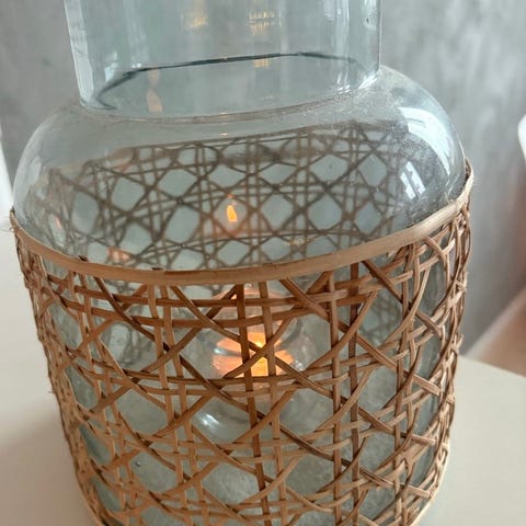 T-lys-lykt i grønt glass. Kubisk form med innfelt holder til telys i midten. Glassmaterialet har en transparent grønnfarge med struktur og luftbobler som gir et dekorativt uttrykk. Størrelsen fremgår av bildet med tommestokk for omtrentlig mål. Egnet til bruk med standard telys på bord, hylle eller vinduskarm.