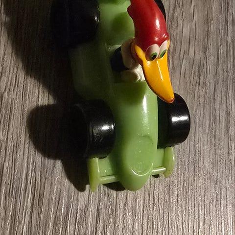 Plastleke i form av en gul motorsykkel med påstøpt figur i blå drakt. Leken har store hjul og er laget i hard plast. Egnet som liten kjøretøysleke for barn som liker kjøretøy og figurer. Kan brukes til lek på gulv og andre flate underlag innendørs.Dette er en Wheelie Ridin' Wolf-lekefigur fra Burger King, utgitt i 2010 (noen kilder oppgir 2009) som en del av en kampanje for animasjonsfilmen Sannheten om rødhette 2 (originaltittel: Hoodwinked Too! Hood vs. Evil).
