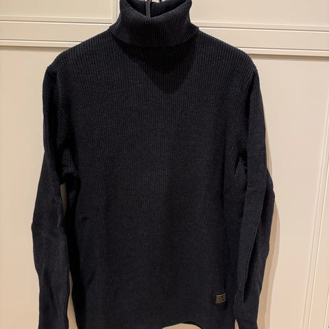 H&M genser for herre i størrelse M. Genseren er beige og laget av 100 % bomull. Den har høy hals og lang erm, med ribbestrikket struktur i stoffet. Passer som hverdagsgenser eller til bruk i kjøligere vær.