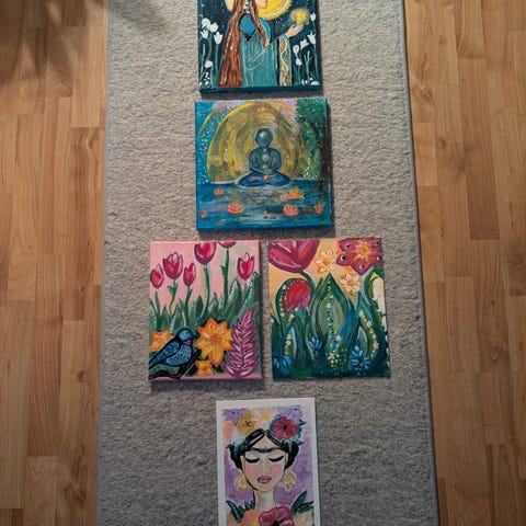 Tegnet og malet av min onkel. Malt på lerret. Mener bildene er 100x70 cm, kan måle om ønskelig ved interesse. Må hentes.