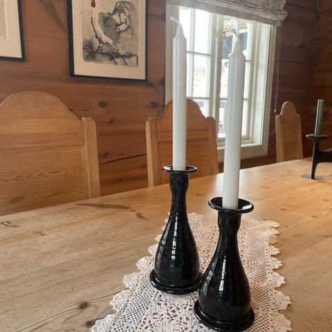 Klassisk utforming med rund fot og slank stett til kronelys. Passer til standard telys/kronelys-størrelse og kan brukes som borddekorasjon i stue, spisestue eller andre rom. Selges som et sett med to lysestaker.