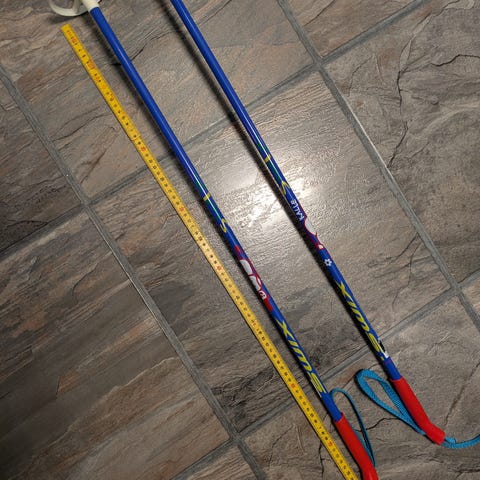 Langrennsstaver fra Swix 95 cm i hvit og blå farge. Stavene har håndtak med løkker og trinser nederst.
