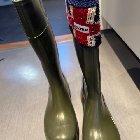 Hunter regnstøvler i størrelse 42. Støvlene har svart fot og skaft med gullfarget mønster. De er laget i gummimateriale med mønstret yttersåle for godt grep. På bildene følger det også med et par svarte, avtakbare støvlefor som kan brukes for ekstra varme og komfort. Passer til bruk i regnvær og fuktige forhold.