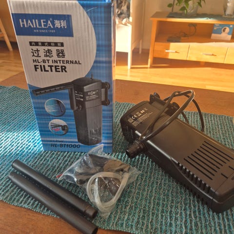 «Innvendig filter for akvarier mellom 50 - 150 liter. Vanngjennomstrømning 500 liter i timen. Enkel rengjøring av filterpatronen da beholderen løsnes uten at motordelen på filtret må tas ut. Alt av ledninger og sugekopper blir urørt for enkelt vedlikehold av filtret.