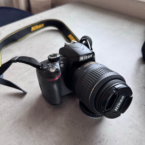 Nikon speilreflekskamera i svart med utskiftbart zoomobjektiv. Kameraet har ergonomisk grep, innebygd blits og toppmontert programhjul for valg av opptaksmoduser. Leveres med objektiv med manuell fokusring og zoomring, samt frontdeksel. Egnet for generell fotografering som portretter, landskap og hverdagsbilder, og kan brukes både med automatisk og manuell innstilling av eksponering og fokus.