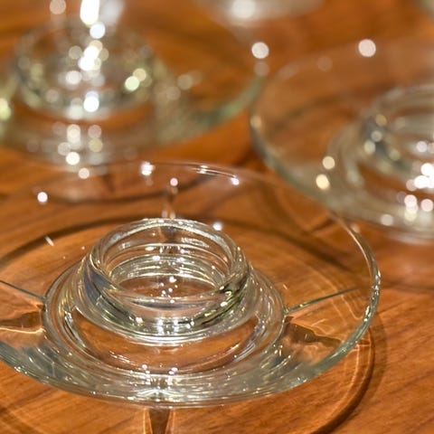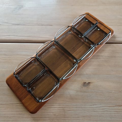 Laget av teak og røkfargede glasskåler.
