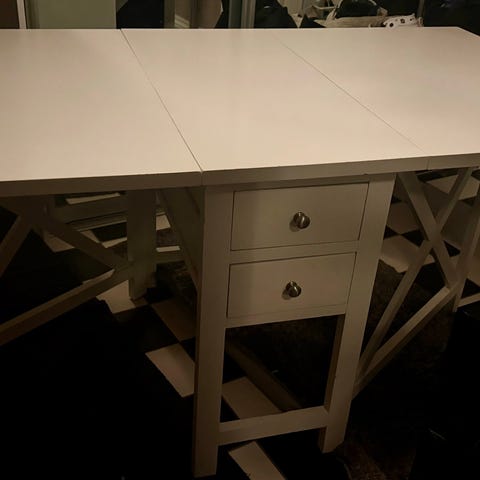 Med 2 klaffer og en skuff. L 123,5 cm, utslått. 65 cm med klaffer nede. B 78 cm, H 75 cm. Må hentes på Høvik.