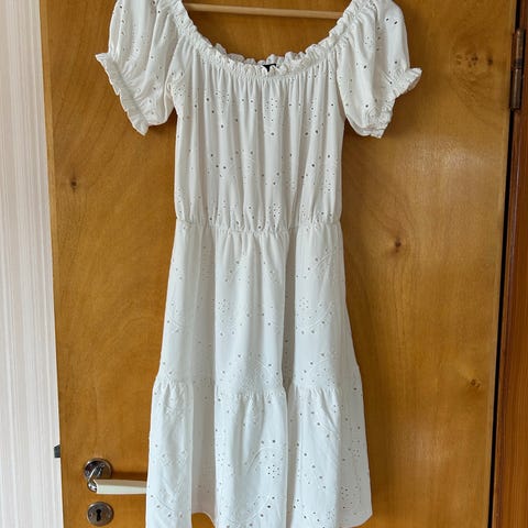 Hvit Neo Noir sommerkjole, str S med korte ermer, rund hals og innsvinget midje med smock. Skjørtet har A-line-fasong og faller omtrent til kneet