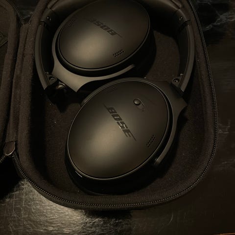 Bose QuietComfort around-ear hodetelefoner i svart farge. Over-ear design med polstrede øreklokker og hodebøyle for komfort ved lengre bruk. Leveres med hard etui for oppbevaring og transport. Egnet til bruk med kompatible lydkilder via trådløs eller kablet tilkobling, avhengig av modell og tilgjengelig kabel.