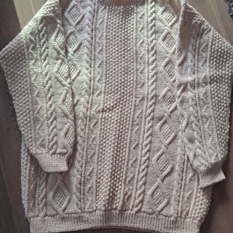 Hjemmestrikket ull-genser med v-hals. Strikket i strukturmønster både foran og bak. Stor v-hals.