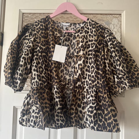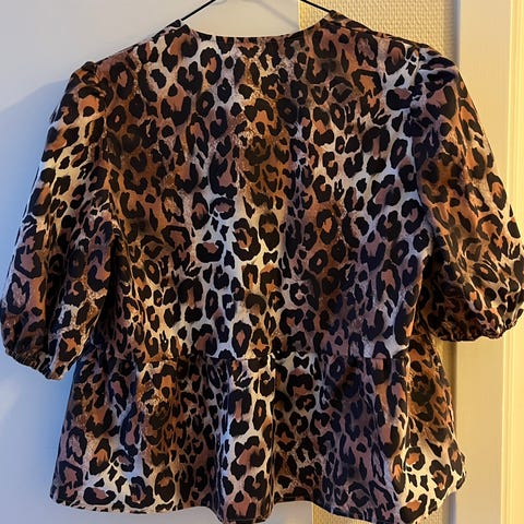 Brukt og vasket to ganger. Knyting i ryggen som gir fin detalj. Gjør også at blusen kan tilpasses i størrelsen.
