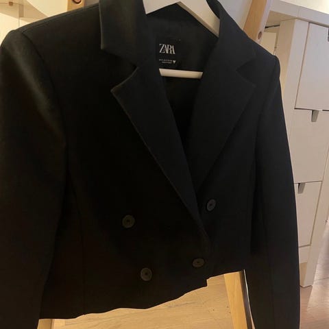 Zara jakke for dame i størrelse M. Jakken er svart og laget i akryl. Modellen har krage, knapper i front og to brystlommer med klaff. Passer som ytterjakke i overgangssesonger eller til hverdagsbruk.