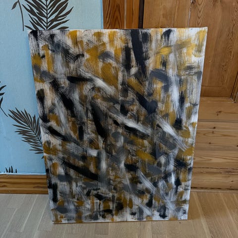 Abstrakt maleri på lerret i svart med detaljer i gull og hvitt. Bildet har stående format og er montert på blindramme, klart til oppheng på vegg. Passer som veggdekor i for eksempel stue, gang eller kontor. Merke og modell er ikke oppgitt.