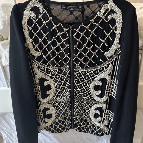 Selger helt ny svart cardigan i fløyel med sølve paljetter for 170 kr.