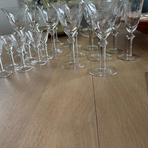 9 nydelige krystall rødvinsglass fra Krosno i serien "Blåklokke" produseres ikke lenger.